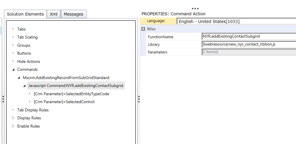 Notice that we are using the name of the subgrid and the GUID of the required view. After uploading this script as a javascript webresource, we have to change the behavior of the “Add Existing” button using Ribbon Workbench. Change it to call our NYR.addExistingContactSubgrid function. In this case my webresource name is nyr_contact_ribbon.js.