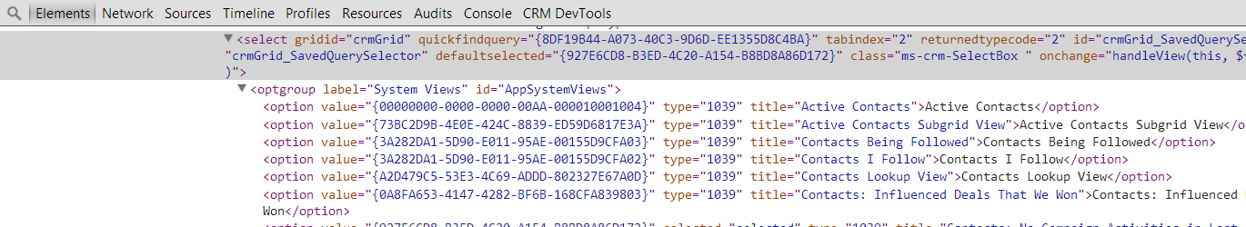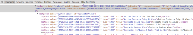 In this case, the subgrid is called accountContactsGrid. Next we have to get the GUID of the view we want to default to. There are two ways to do this: looking into the database or using Developer Tools. Open an account record, and try to add a contact to the subgrid. When the lookup selection popup appears, use Developer Tools to get the GUID of the required view. In this case, we want the GUID of Contacts: No Campaign Activities in Last 3 Months view. Note this down, as it also required in the script we will add later.