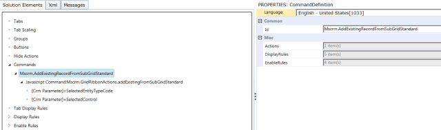 The Mscrm.GridRibbonActions.addExistingFromSubGridStandard function is called with the entity typecode and the grid control as parameters. This has to be changed to call our custom function in a JavaScript webresource.