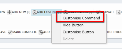 Since this is a 1:M relationship and account relationship field is not mandatory on contact record, the first Add Existing button has to be customised. Right click on the first Add Existing button and click Customise Command.