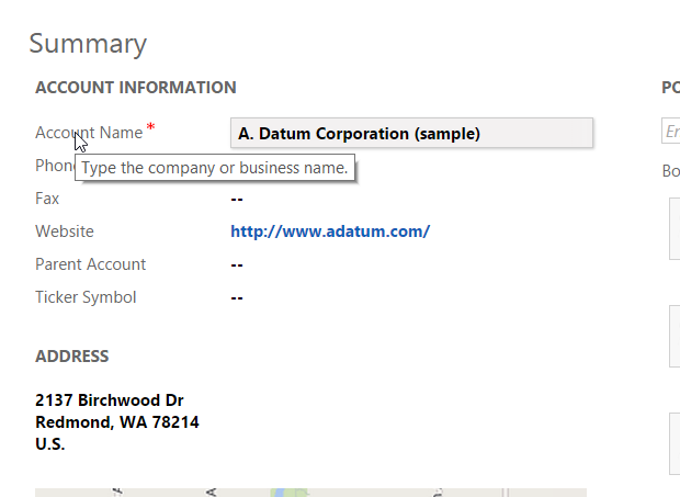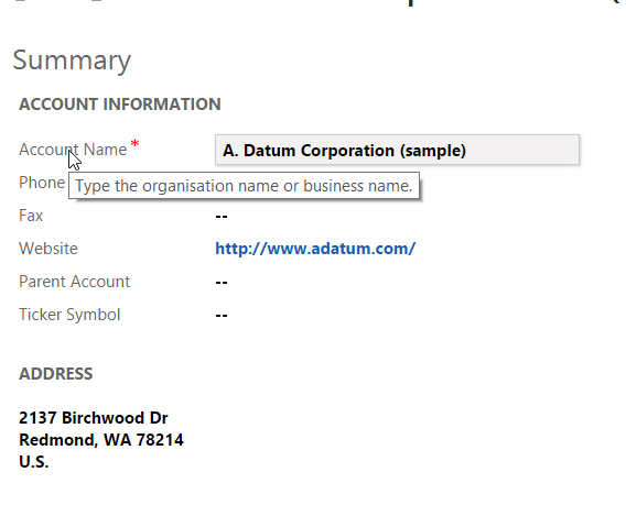 The account name field will show the tooltip text as “Type the company name or business name” when the user hovers over the label.