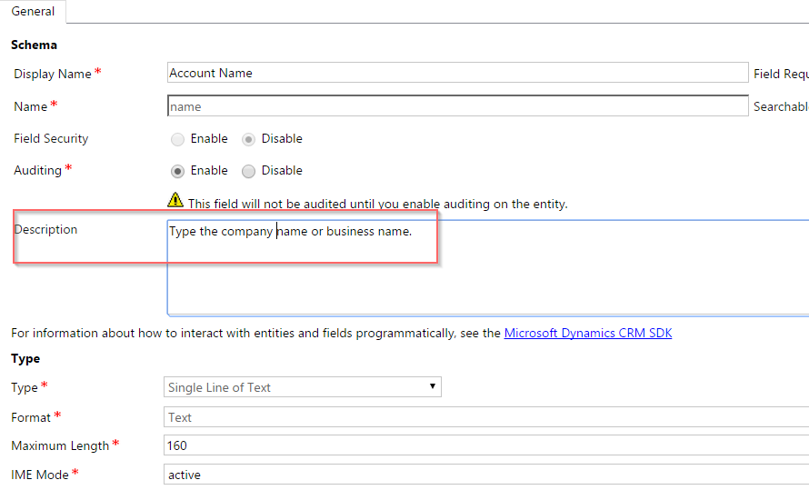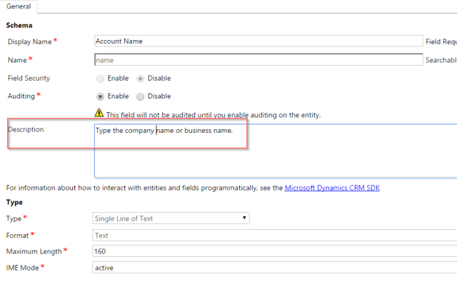 Next open the file in Excel and update Description for the attributes that require a different tooltip text, I this case I am going to change the tooltip text only for the Account Name field to “Type the organisation name or business name“.