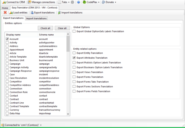 If we want to setup meaningful tooltips for lot of fields, it is easier to do this via Easy Translator. First export the selected entity to Excel using Easy Translator. I this case I have just chosen Account. We just want to export only the Attributes.