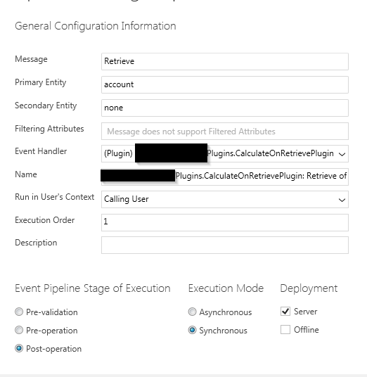Here is how the plugin is registered in the Plugin Registration tool. It executes on Retrieve of account.