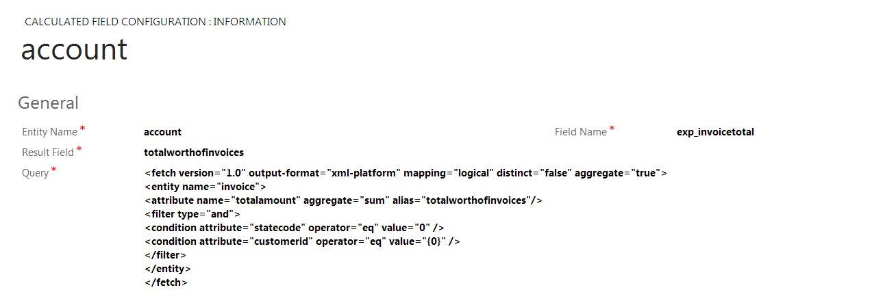 In this case, the account field exp_invoicetotal will use the fetchxml result’s totalworthofinvoices. This is an aliased field. Note that we use {0}, that will be replaced by the primary key of the entity that the plugin executes on.