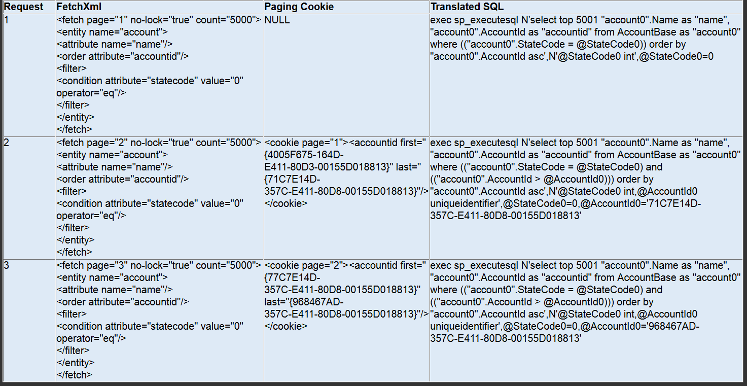 Looking at how paging cookie translated to SQL, reminds me of this post from PFE Dynamics guys -> Dangers of Guid.NewGuid. I believe that the entity primary key is generated using NEWSEQUENTIALID, and hence it is not advisable to insert records directly into the MSCRM database. This is also probably how “> uniqueidentifier” query is optimised, as the Guid is in sequence, and the clustered index on the primary key can be efficiently used in this query.