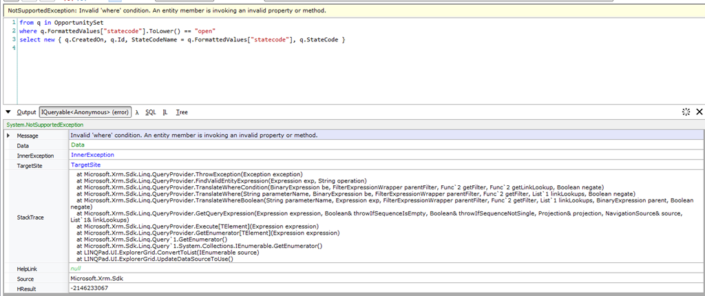 LinqPad is a great tool to quickly query CRM and export the records you want, for further processing. LinqPad Driver for Dynamics CRM is what this post is about – specifically on how to use “FormattedValues” in your queries. There are formatted values for Money, Optionset and DateTime. I will demonstrate on how to use Optionset text values in where condition.