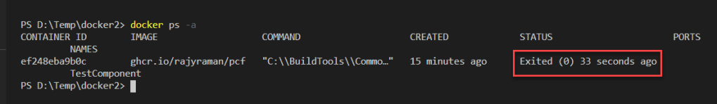 Step 5: Run the command below in VSCode’s PowerShell Terminal window to create the container from the image in GitHub Container Registry. I have specified the name of the container as “TestComponent” in the example below, but pick a different name based on the component name for the container.