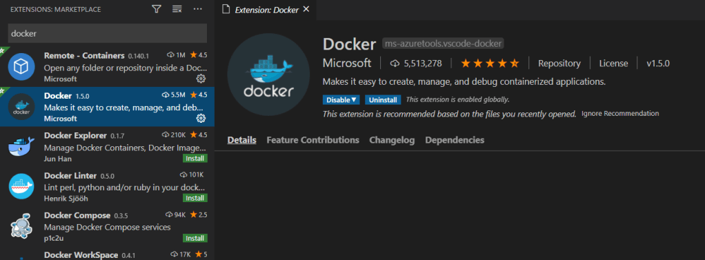 Step 5: Install Docker extension for VSCode, if you want to use the GUI, rather than commands for working with containers.