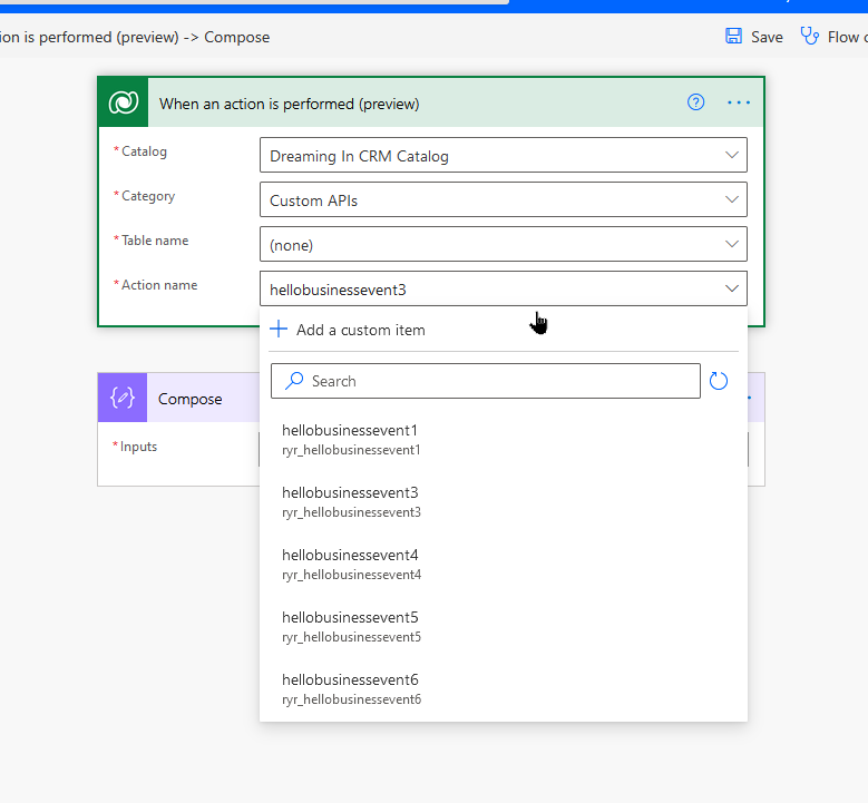 Next step is to create the Flow with the “When an action is performed” trigger. In this trigger you need to choose the Root catalog, the sub-catalog and the custom API in that sub-catalog.