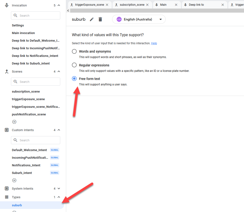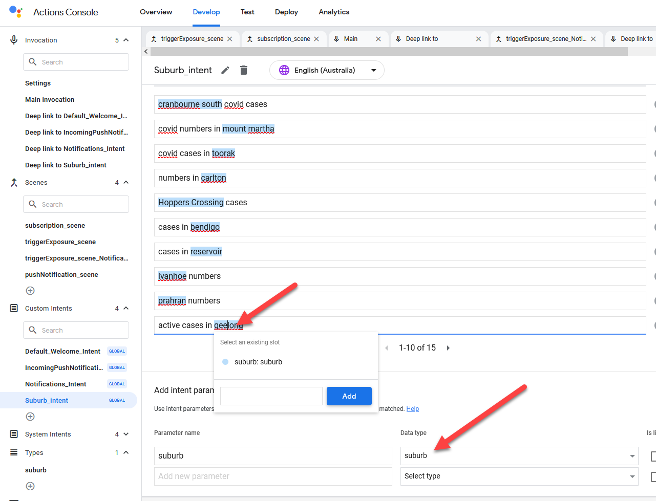 - Suburb_intent – When the user says something like “Show me the numbers for Melbourne”, it will be mapped to this intent. A Flow (webhook) will be called to get the response for this intent