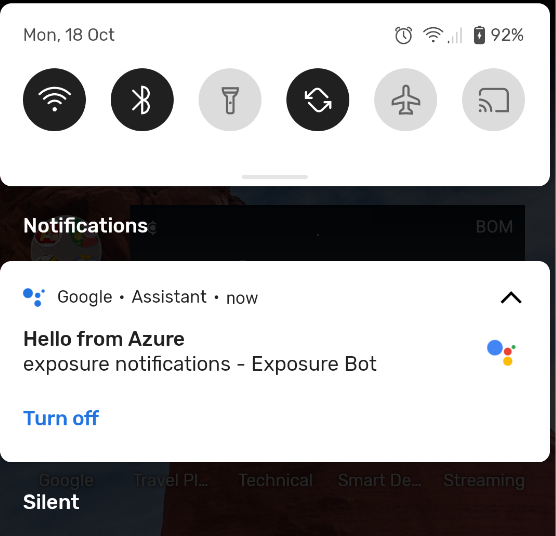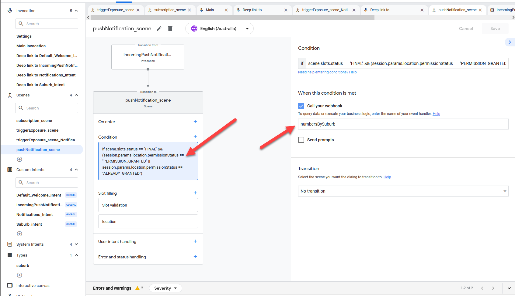 - IncomingPushNotifications_Intent – There is a scheduled Flow that sends exposure notifications three times a day to the user. When the user clicks on that notification, this intent is invoked. But, as you can see when that happens, the conversation immediately ends. The user should never hit this intent in this scene.