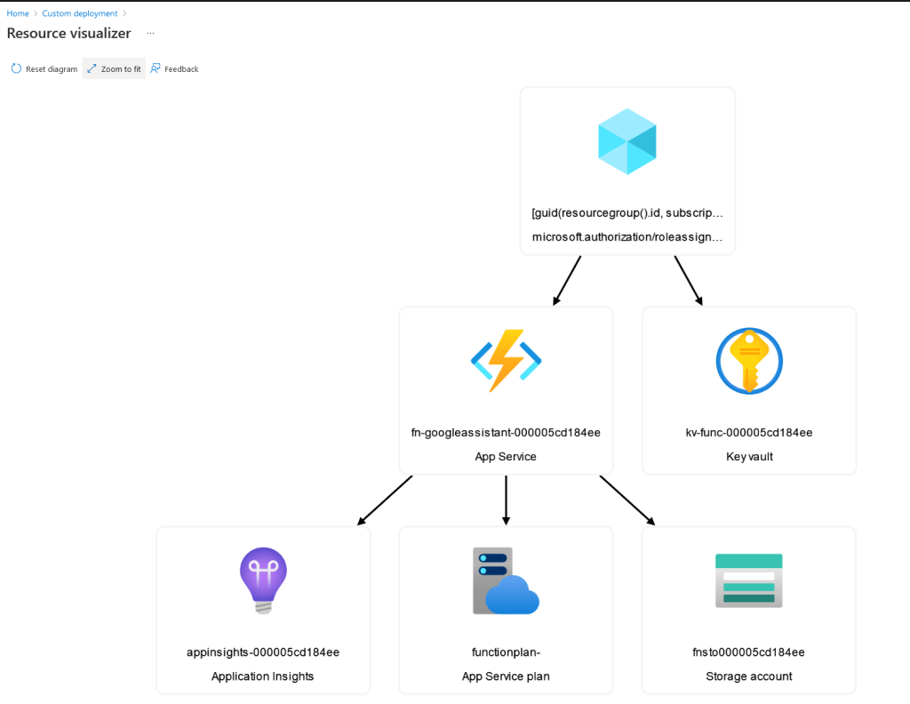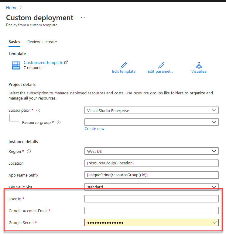 The next part is setting up the Azure resources: Function App, Storage Account, App Insights and Key Vault. Head over to https://github.com/rajyraman/Google-Actions-Push-Notifications where you have a deploy to Azure button. Click the button and fill in the Google Account Email, Google Secret and you Azure User Id.