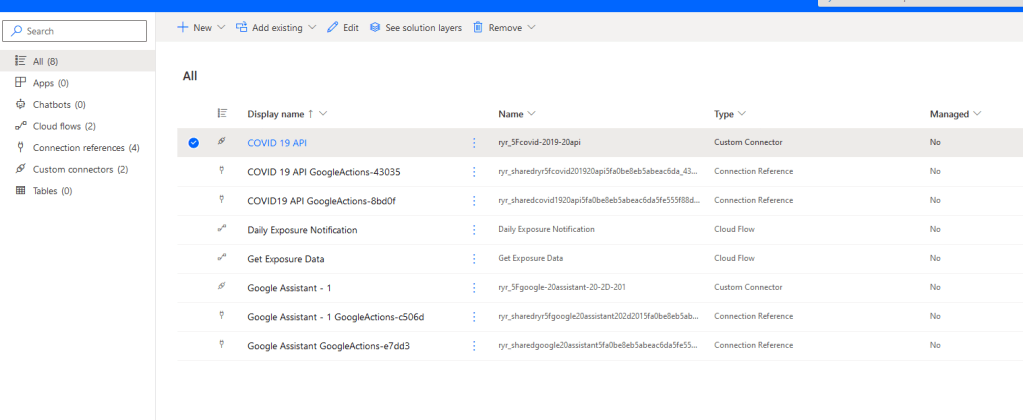 You can download the Managed Solution with Custom Connectors and Flows from https://1drv.ms/u/s!AvzjERKFC6gOyAZf2Mw1f2QkgYft?e=HL1bnV. Here is how the solution looks.