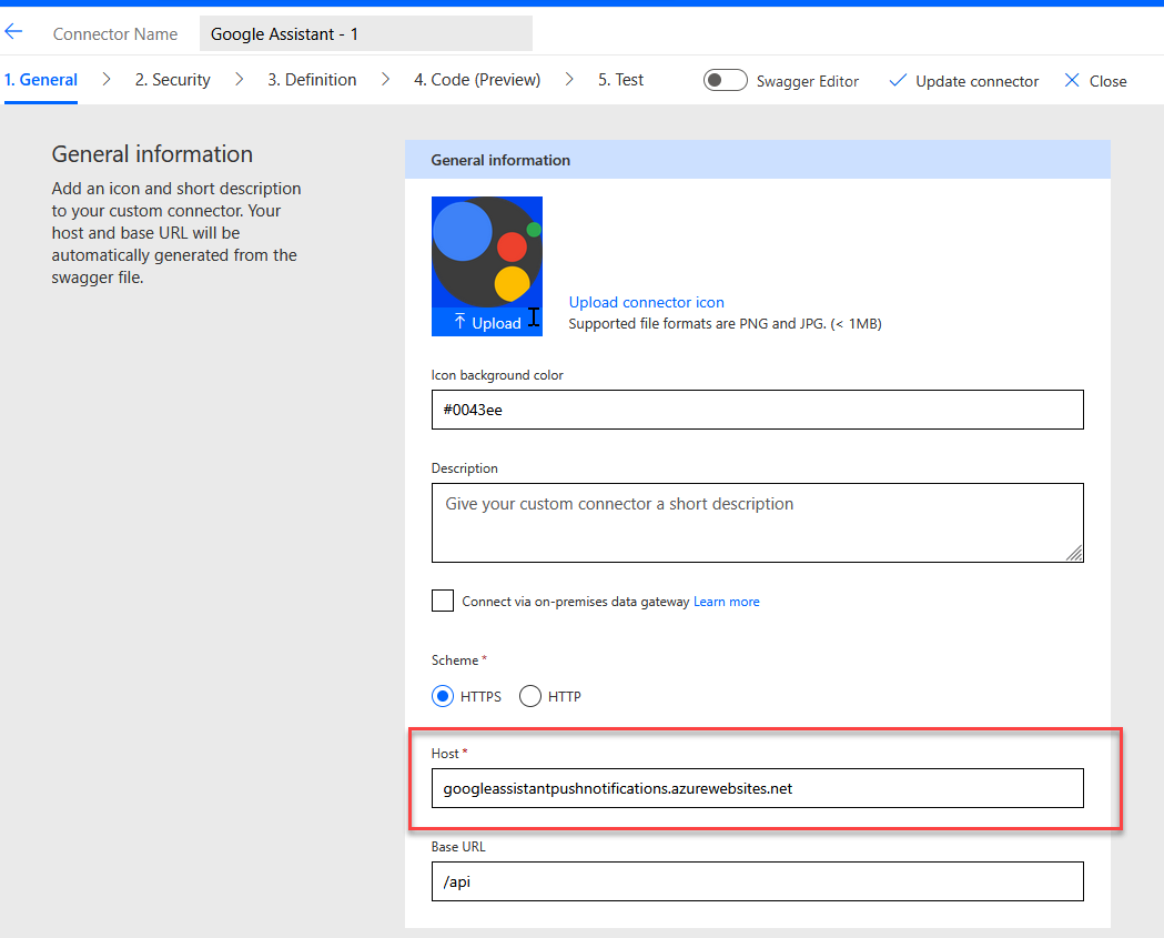 After importing you also have to change the base URL of the Google Assistant custom connector to point to the correct base URL of your Function App. This is the Function App that manages subscription for locations, Google API authentication and sending push notification to the user.