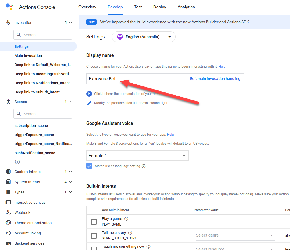 The first thing you need to do is name your bot. I have named mine as “Exposure Bot”. This means that the user can trigger the bot by saying “Talk to exposure bot” to the Google Assistant.