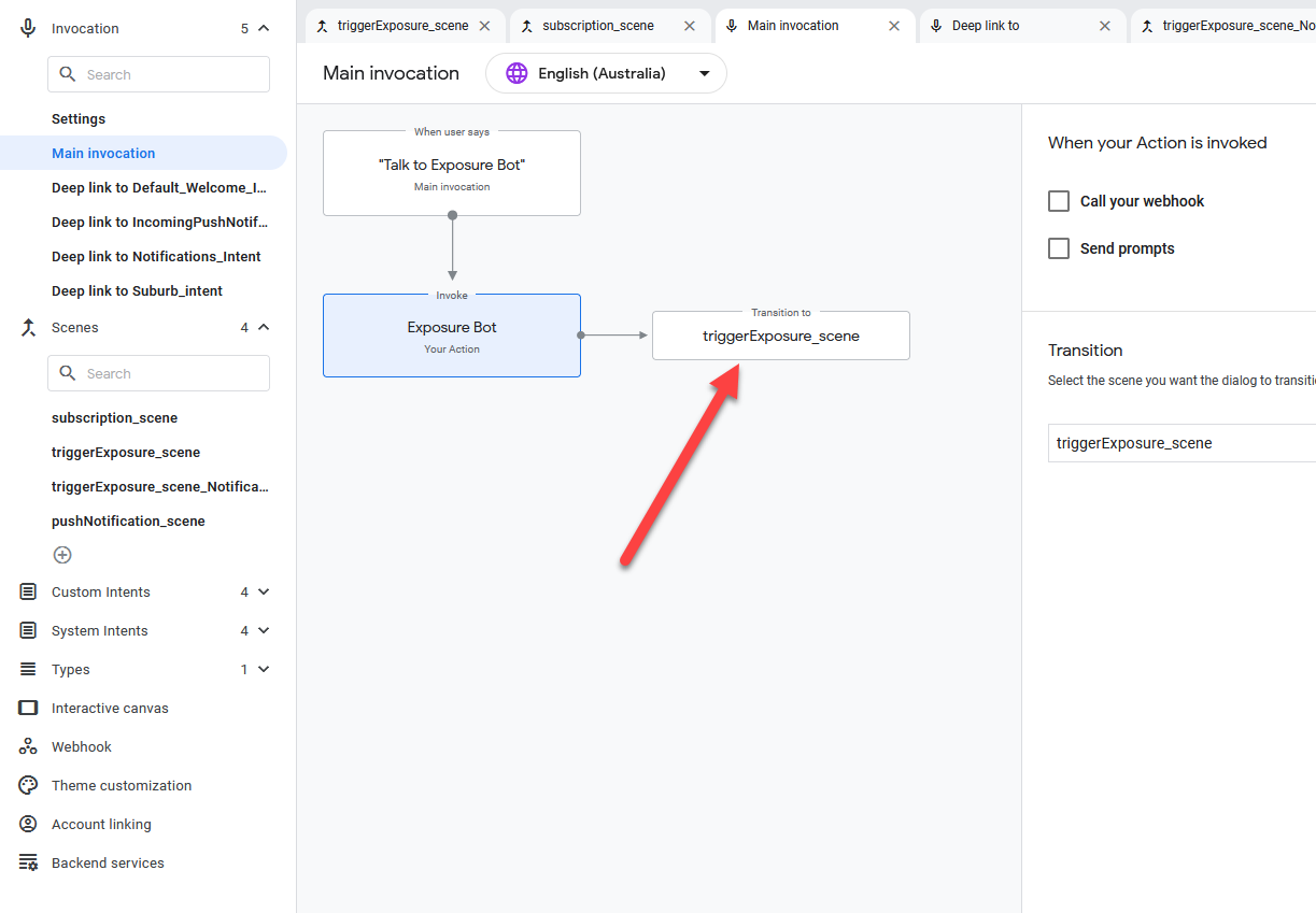 We then need to create one or more scenes to handle the user’s input. After the user has triggered the bot using the phrase “Talk to exposure bot”, she is then transferred to a scene called triggerExposure_scene.