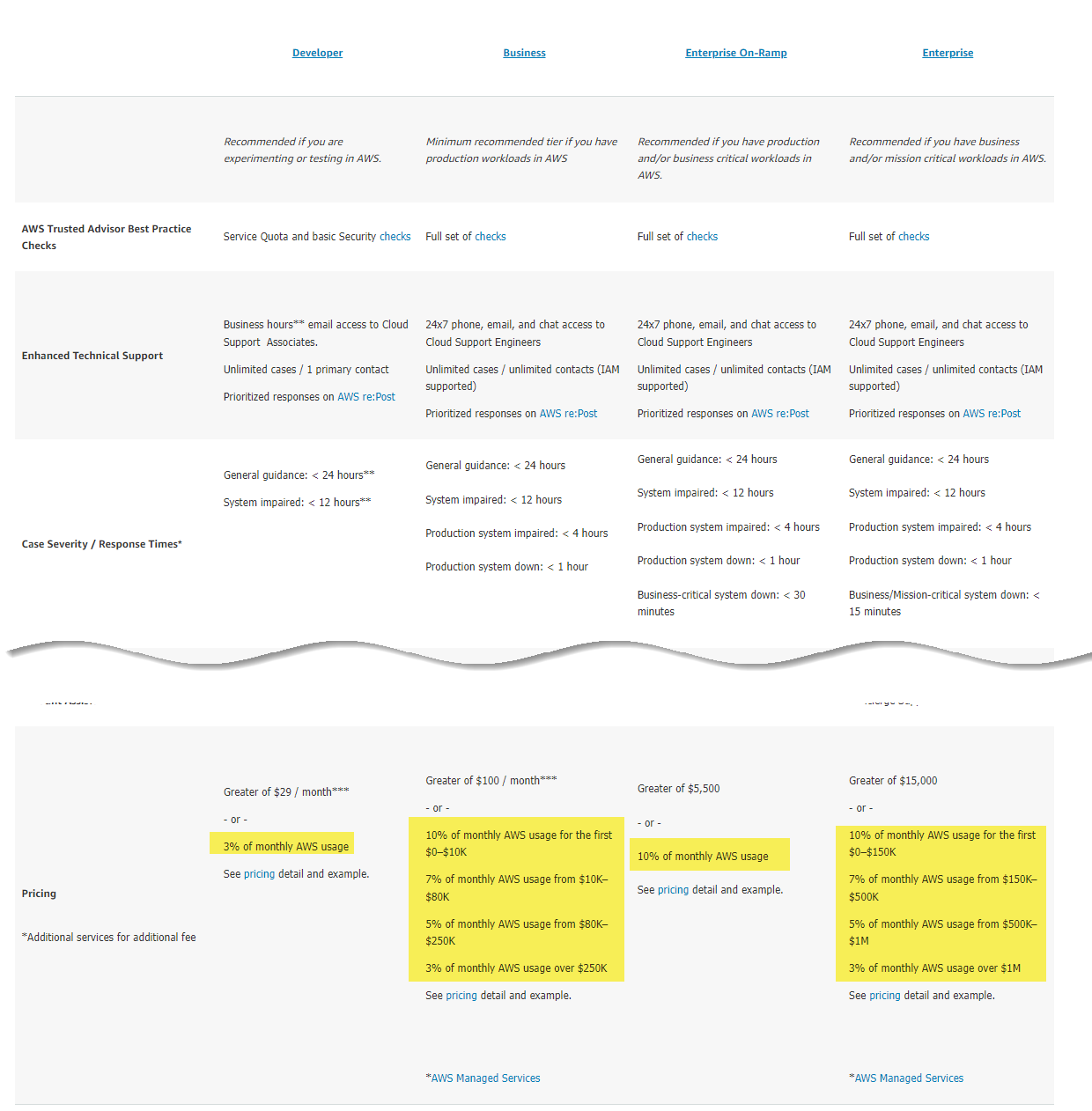 The big surprise to me was how AWS charges for support plans. If you exceed the spending cap, you are charged percentage of your spending as the support cost.