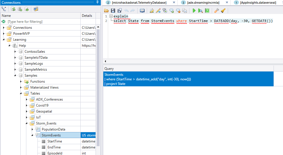 Now, we are ready to write our KQL query. One easy way to learn KQL is to use explain to transpile SQL to KQL. It translates your SQL query into KQL query.