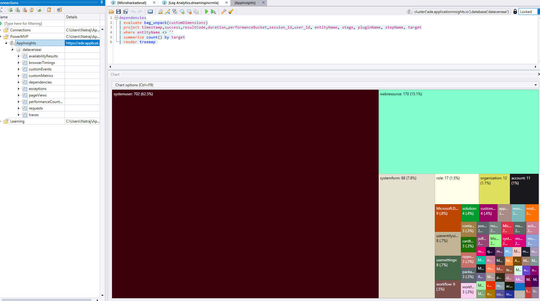 Example below shows which Dataverse tables are being used the most based on AppInsights data. The result is rendered using the treemap chart, which is one of the chart types available OOB. How amazing is that!